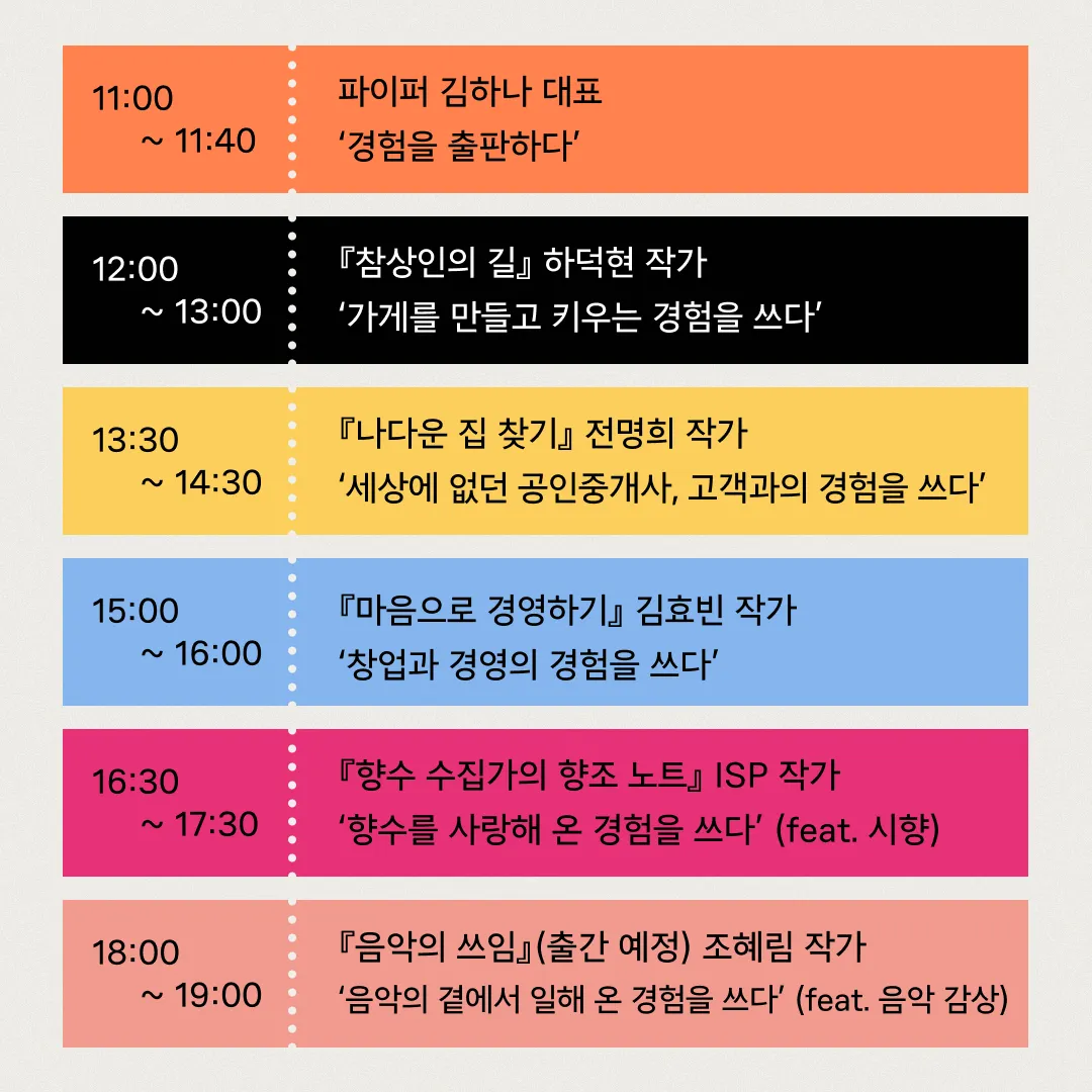입구에서 성함 확인 후, 티켓 역할을 하는 팜플렛을 드립니다. 팜플렛을 보여주시면 당일 재입장이 가능합니다. 선택하신 북토크 외의 시간에도 자유롭게 입장하실 수 있습니다.